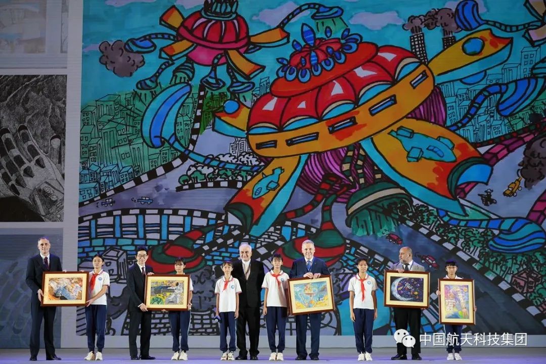 大会开幕式上举行了“我的太空梦”航天主题绘画赠礼。来自海南省文昌市龙楼镇航天小学的小朋友们展示了精心创作的绘画作品,分享了背后的创作故事,并向外宾赠送作品。